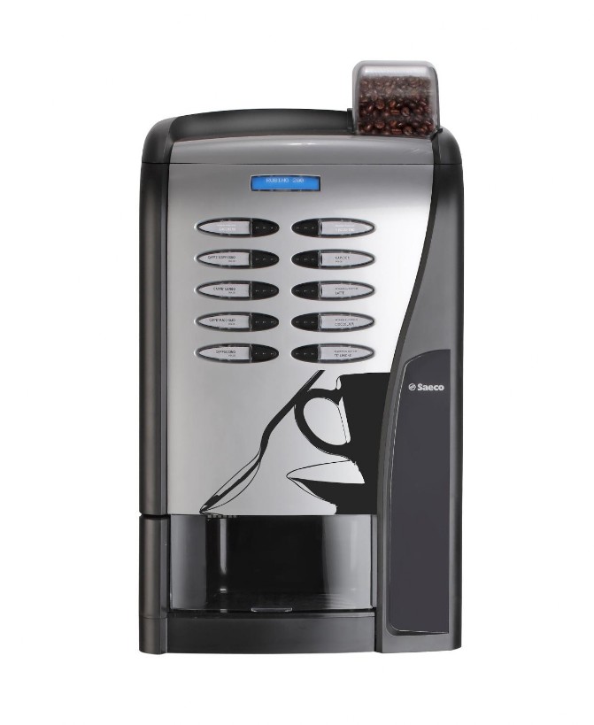 Кофейный торговый автомат Saeco Rubino 200 Espresso – итальянский вертикальный прибор комбинированной цветовой гаммы для продажи кофе-напитков в людных местах: учебных и административных заведениях, на вокзалах, автозаправках с кофе на вынос. Основные параметры модели Rubino 200 Espresso: